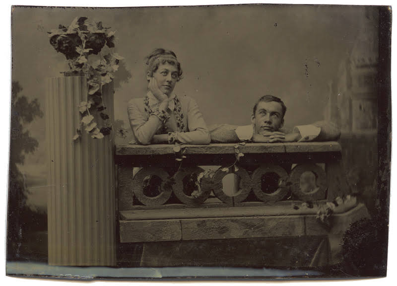 A woman and a man imitating the poses of the two cherubs in Raphael's Sistino Madonna