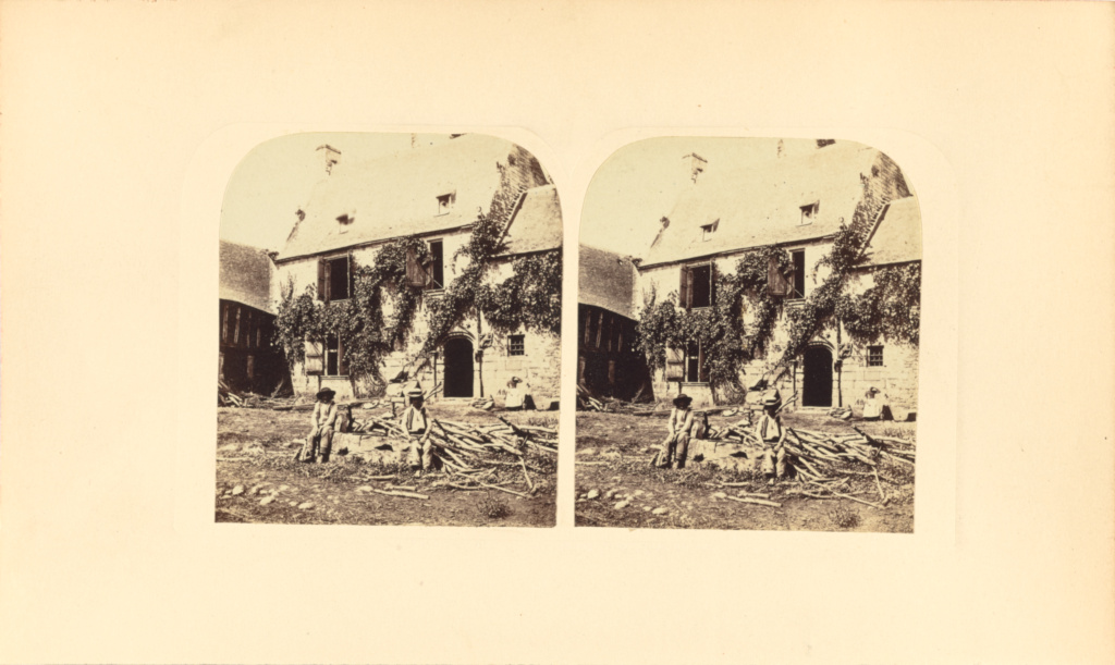 Stereographic views of two young men sitting in front of a woodpile outside of a chateau. The young men are wearing matching clothes and each has a hat. The walls of the chateau are overgrown with ivy.