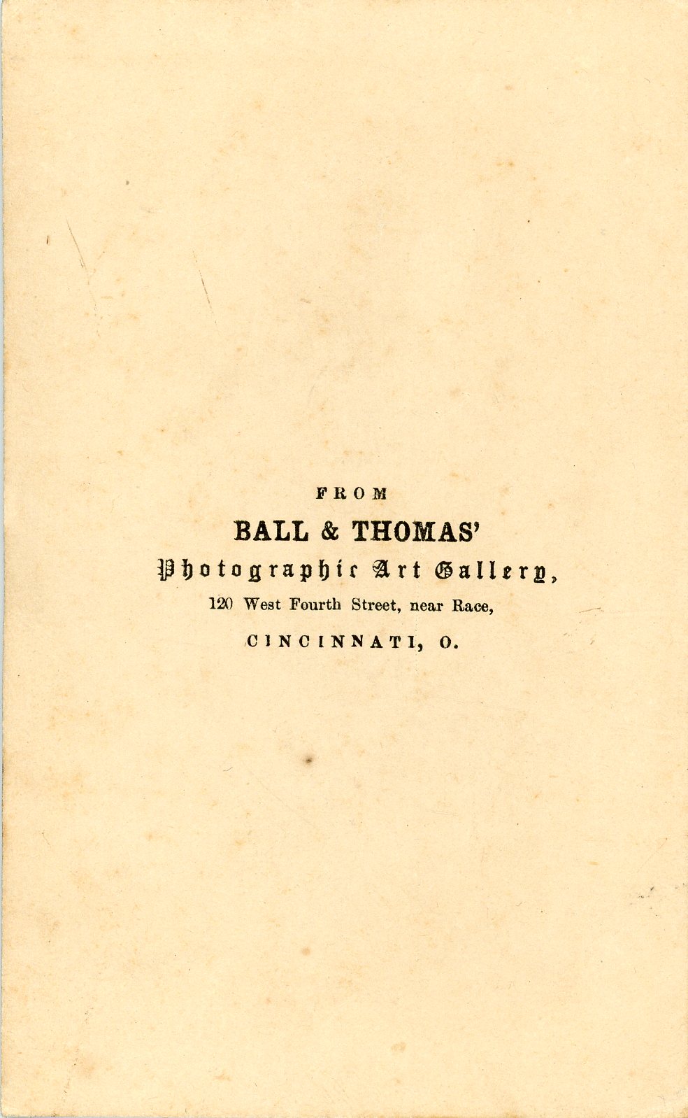 Backmark for "Ball & Thomas' Photographic Art Gallery, 120 West Fourth Street, near Race, Cincinnatim O."