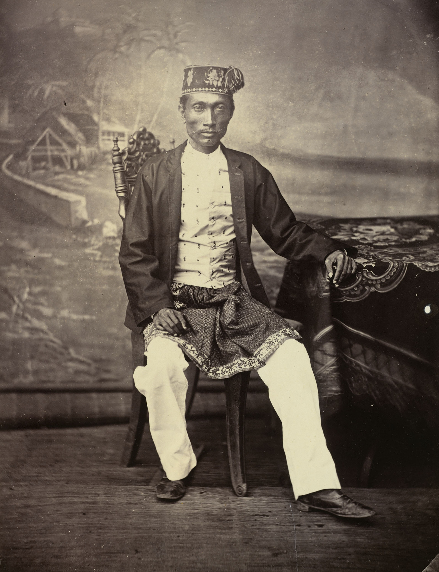 Photograph of a full length portrait of Sultan Mahmud Al-Rashid (1829-73), Sultan of Deli, North Sumatra seated, facing the camera front on. The Sultan wears a cap, a dark colour jacket, light colour patterned shirt, a half-length sarong, light colour trousers and dark colour shoes. He places his left hand on a table covered with a patterned table cloth. He poses in front a painted backdrop depicting a village near a river.