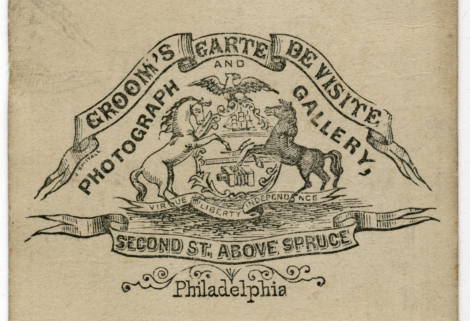 The photographer, Groom of Philadelphia, has an elaborate logo that is the Pennsylvania State of Armswith a twist. The items in the middle of the official shield are from to bottom, a trade ship, a plow and three sheaves of wheat. In this version, the wheat has been replaced by a camera.