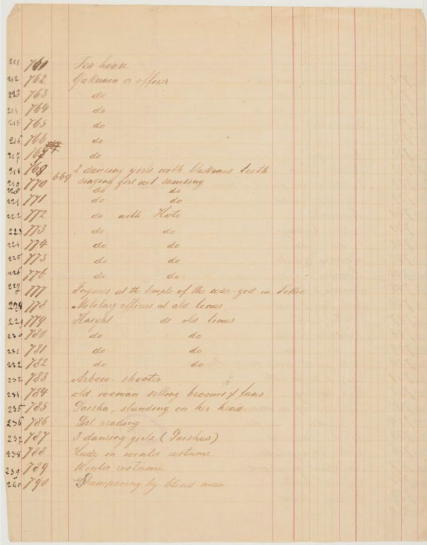 (Note added by Alan Griffiths, 25 June 2019) The date of the ledger has been questioned. Luke Gartlan, a specialist on early photography in Japan, wrote "Stillfried left Japan for good in 1881, but his name persisted in studio names in Yokohama for several years. These albums are a compilation when various studios merged. So I think 1884 is probable for the list." (Facebook, Alan Griffiths page, 25 June 2019)