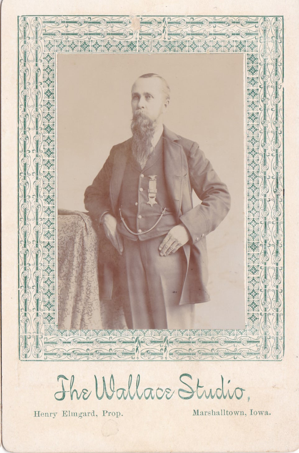 Studio portrait of a standing bearded man with a GAR membership medal (Civil War Union veteran)