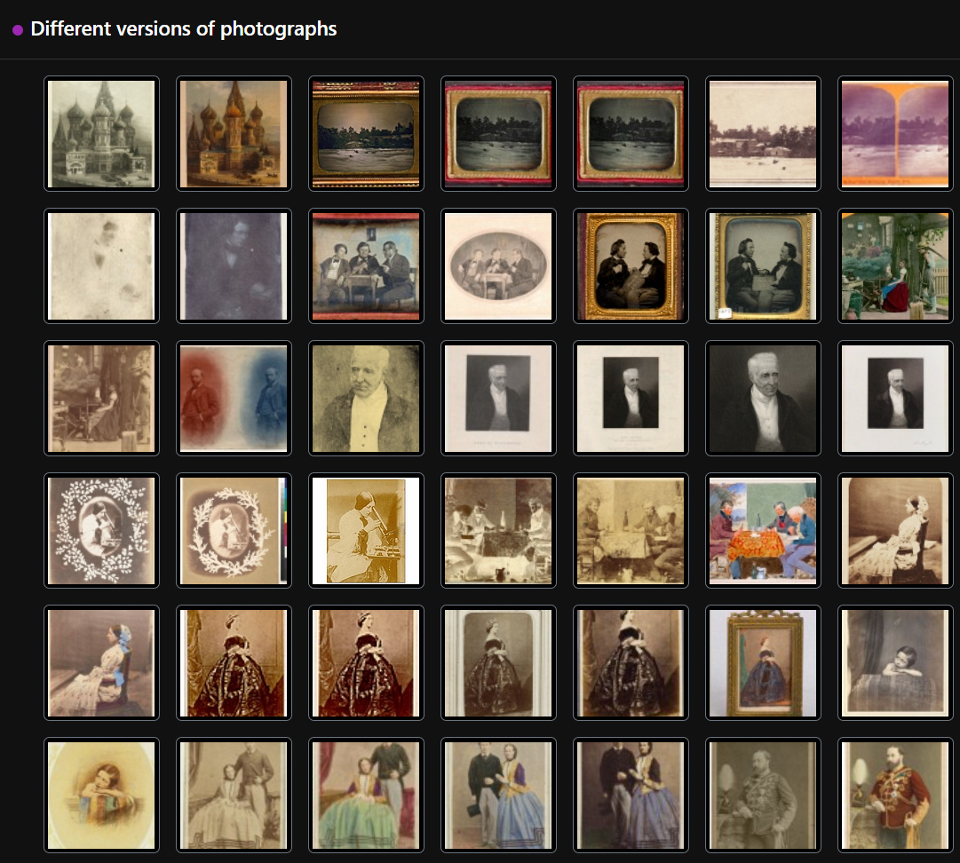 Screenshot from the LINC (Luminous-Lint International Network of Connections) system on Luminous-Lint showing a matrix of different versions of the same photographs