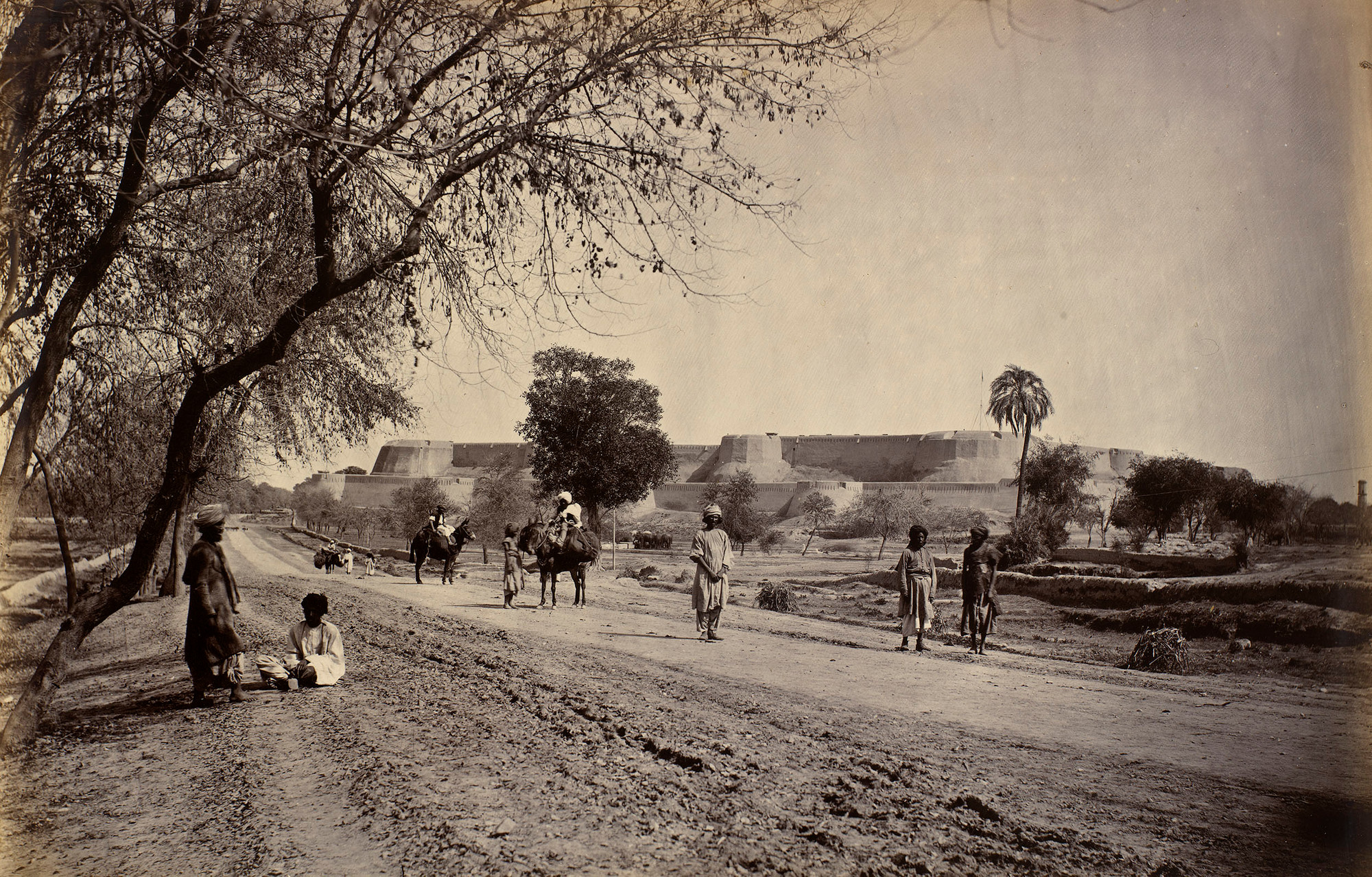 Photograph of the Fort of Bala Hissar, Peshawar. The fort has high stone walls and is surrounded by small trees. There are two donkeys and several small groups of people on the road in the foreground. There is a large tree to the left with two men underneath, one standing and one sitting. The photographer John Burke travelled with the Peshawar Valley Field Force during the Second Anglo-Afghan War (1878-80), one of a series of conflicts between Britain and Russia over control of Afghanistan. His images from the war capture landscapes, key strategic sites and soldiers involved in the conflict.