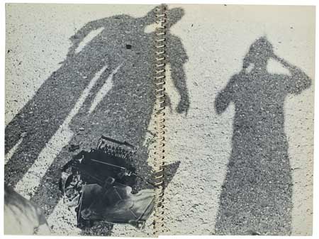 A mock "crime scene" pictorial investigation in which Ruscha (the driver), Blackwell (the photographer) , and Williams (the "thrower") pitched a typewriter outside the window of their 1963 Buick Le Sabre. In addition to pictures showing the protagonists posing alongside the wreckage of the typewriter there are close-ups of its (body) parts.