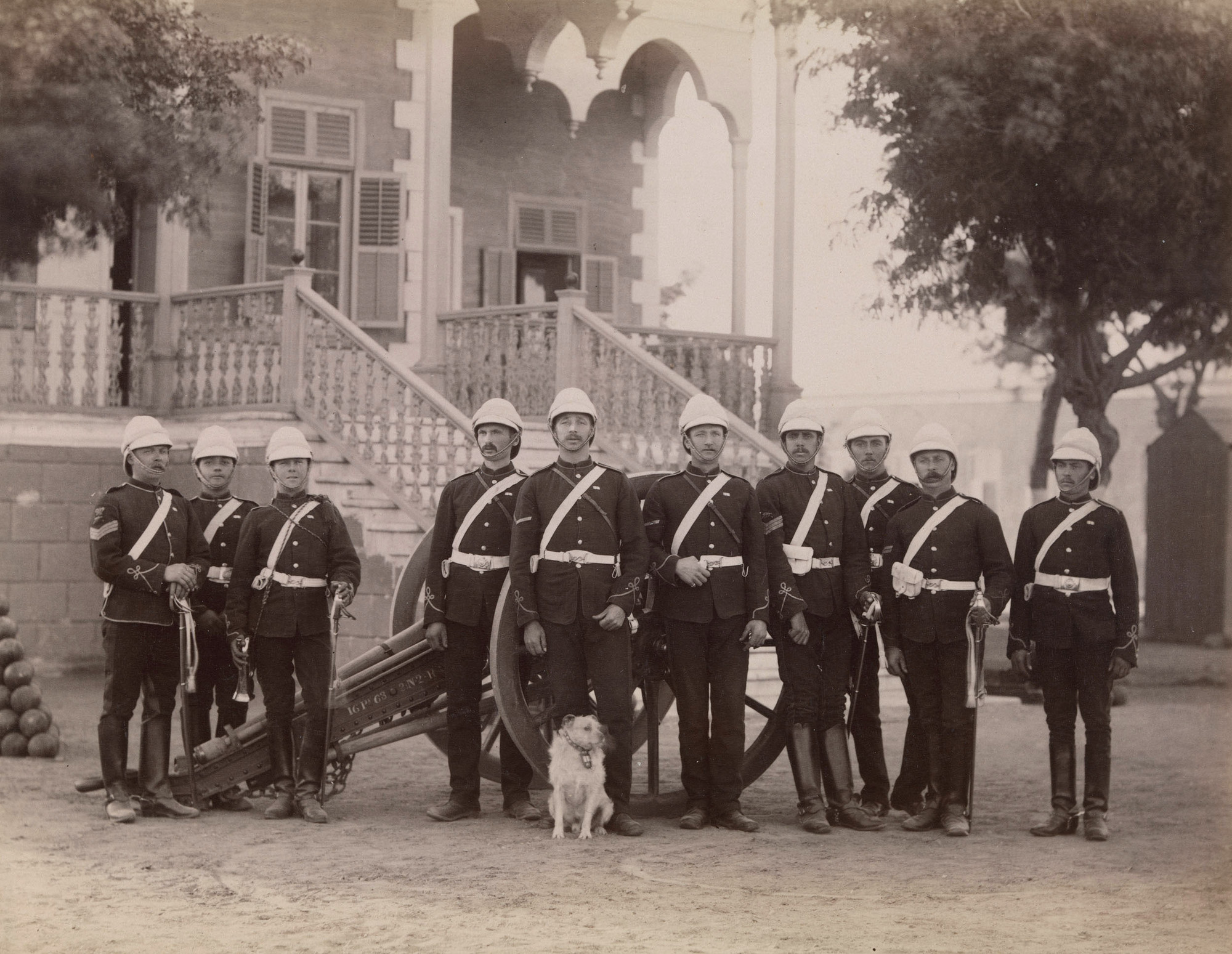 Photograph of soldiers from the Royal Artillery who served in the Anglo-Egyptian War. They are standing in a row in front of a large mounted gun which is facing left. They are wearing military uniform and most are holding a sword. There is a dog called Jack sitting at the front of the group with his head turned to the right. There is a house with a veranda behind. The Anglo-Egyptian War of 1882 repressed the nationalist 'Urabi Revolt and led to increased British control of Egypt. This photograph was taken in Cairo.