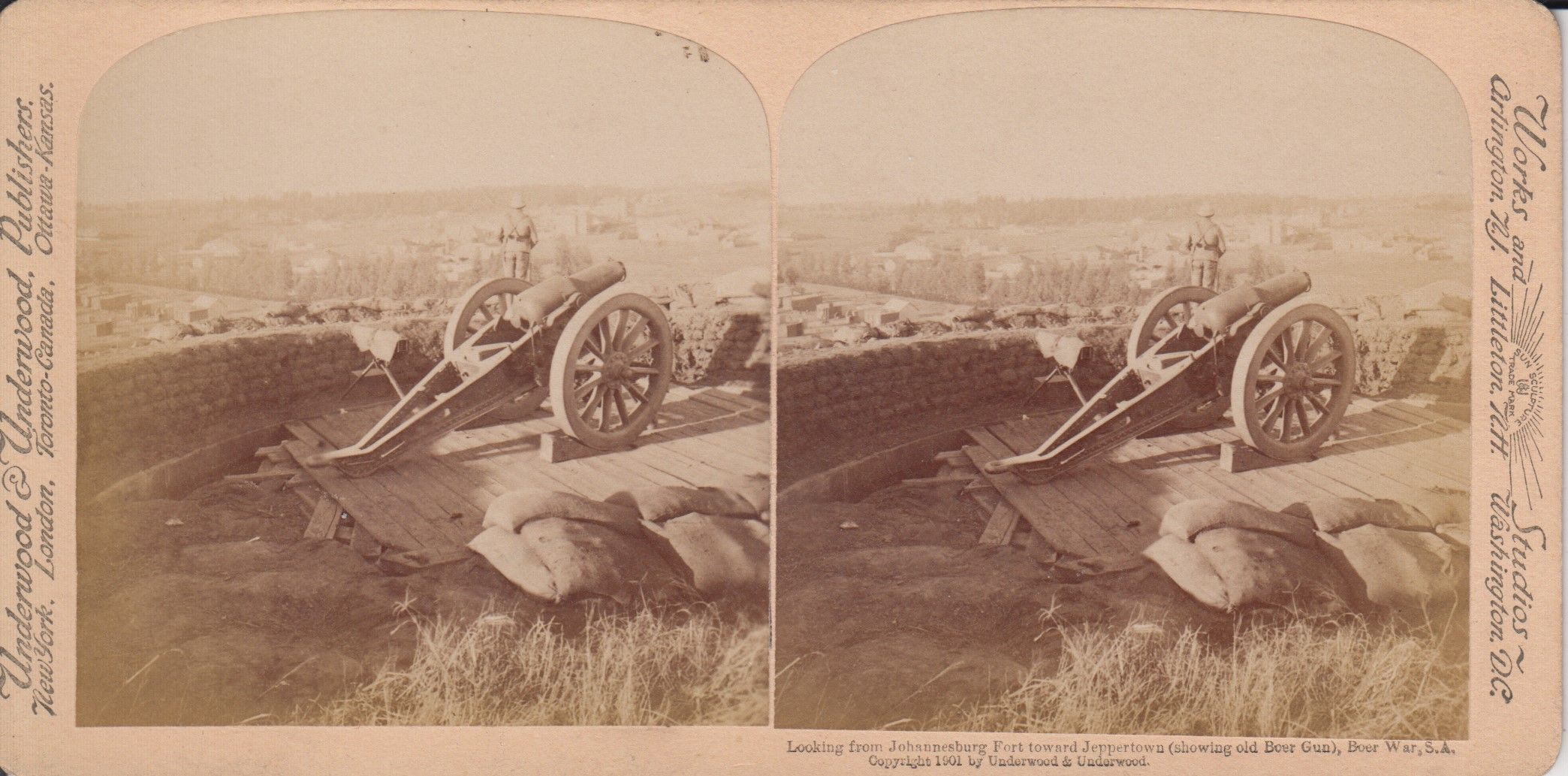 Looking from Johannesburg Fort toward Jeppertown (showing old Boer Gun), Boer War, S.A.