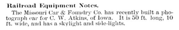 The Missouri Car & Foundry Co. has recently built a photograph car for C. W. Atkins, of lowa. It is 50 ft. long, 10 ft. wide, and has a skylight and side-lights.