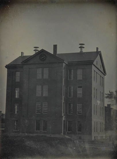 A Boston school house (identified as the Bigelow School) at 3:49 pm