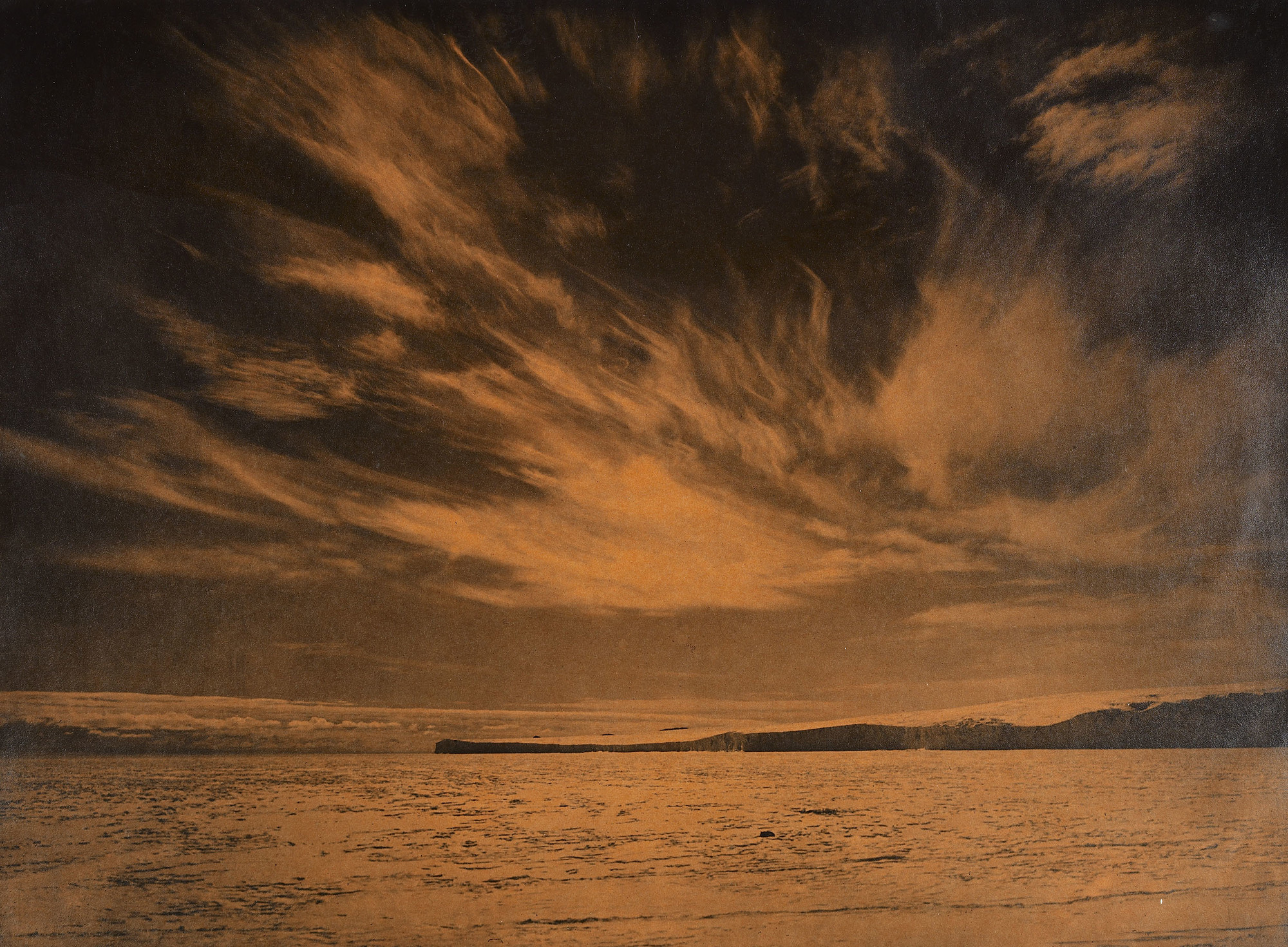 Photograph with the edge of the Barne Glacier on the right and clouds stretching overhead. This cloud study is one of many dramatic scenes that Ponting composed, as he attempted to capture the natural beauty of the vast Antarctic landscape. Ponting printed this image onto orange paper in an attempt to recreate the colours that he experienced. A version of this image was also printed onto blue paper.