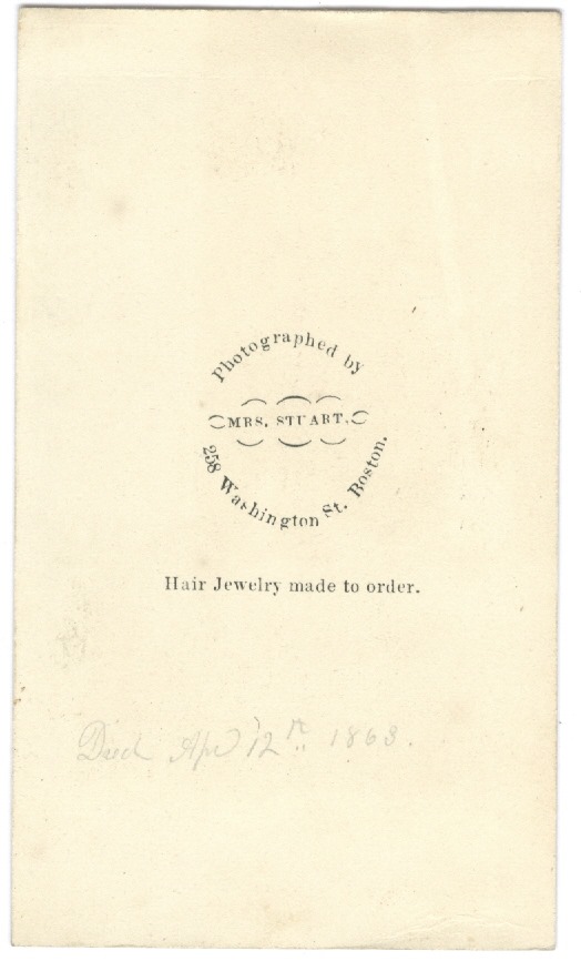 Backmark for "Mrs. Stuart, 258 Washington St. Boston" with "Hair Jewelry made to order."