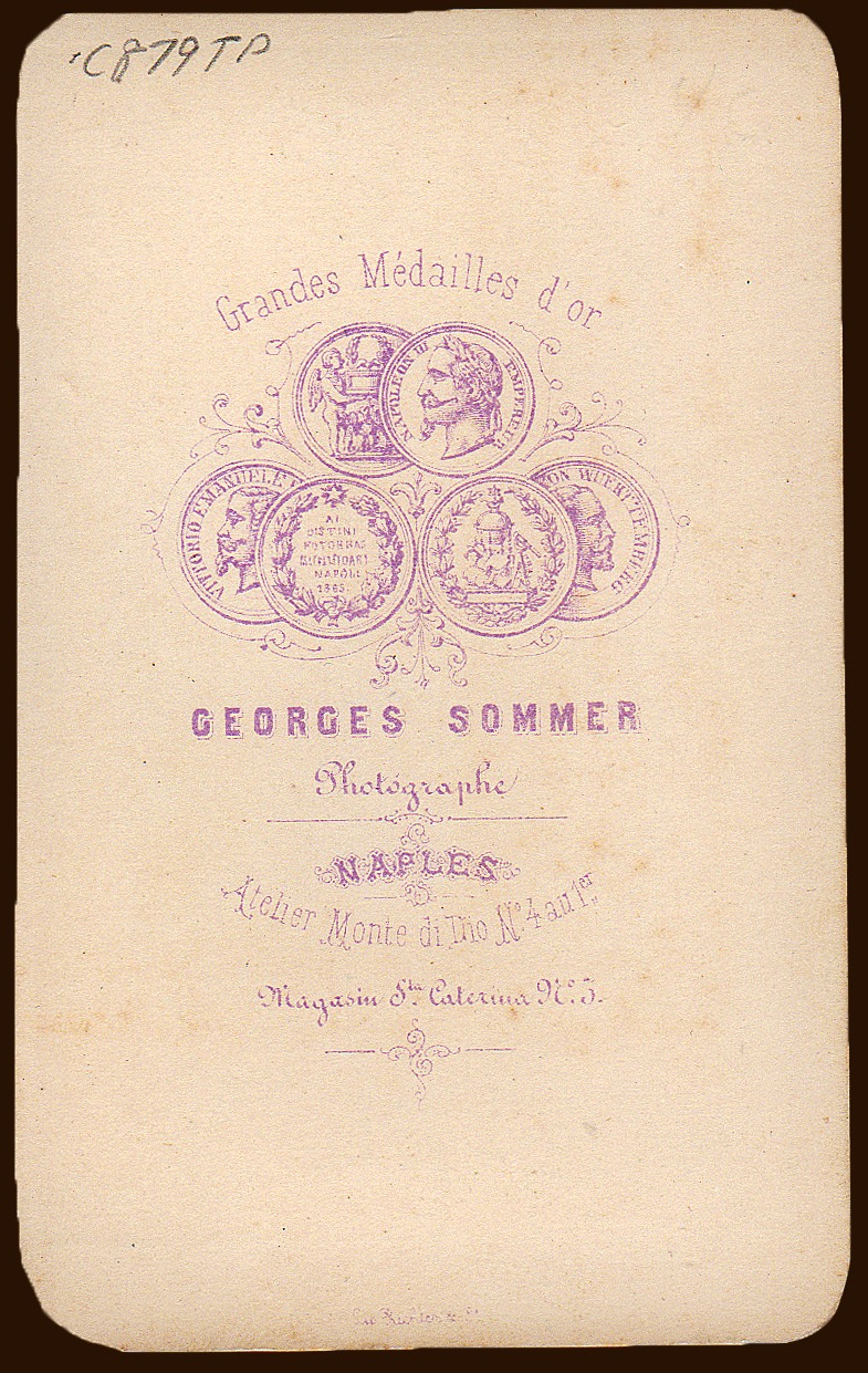 Backmark for "Georges Sommer, Photographe, Naples, Atelelier Monte di Dio No. 4 au 1er. Magasin Sta. Caterina n. 5."