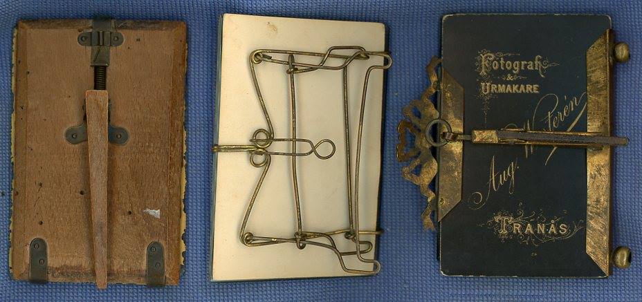 Three different types of stands for carte de visites (lift to right) - wood, wire and pinchbeck