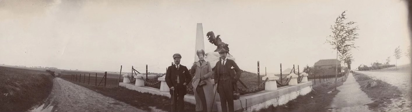 Two men and a woman are posing before the French monument at Waterloo. This sculpture was made by Jean-Léon Gérôme and depicts "L'Aigle Blessé".