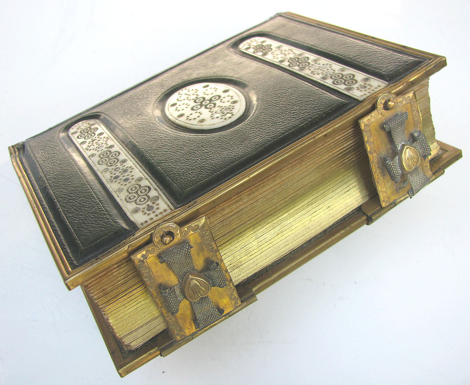 Green Leather Brass edged carte de visite album with Ivory decorations having carved steel inlaid circles and disks with very unusual brass claps.