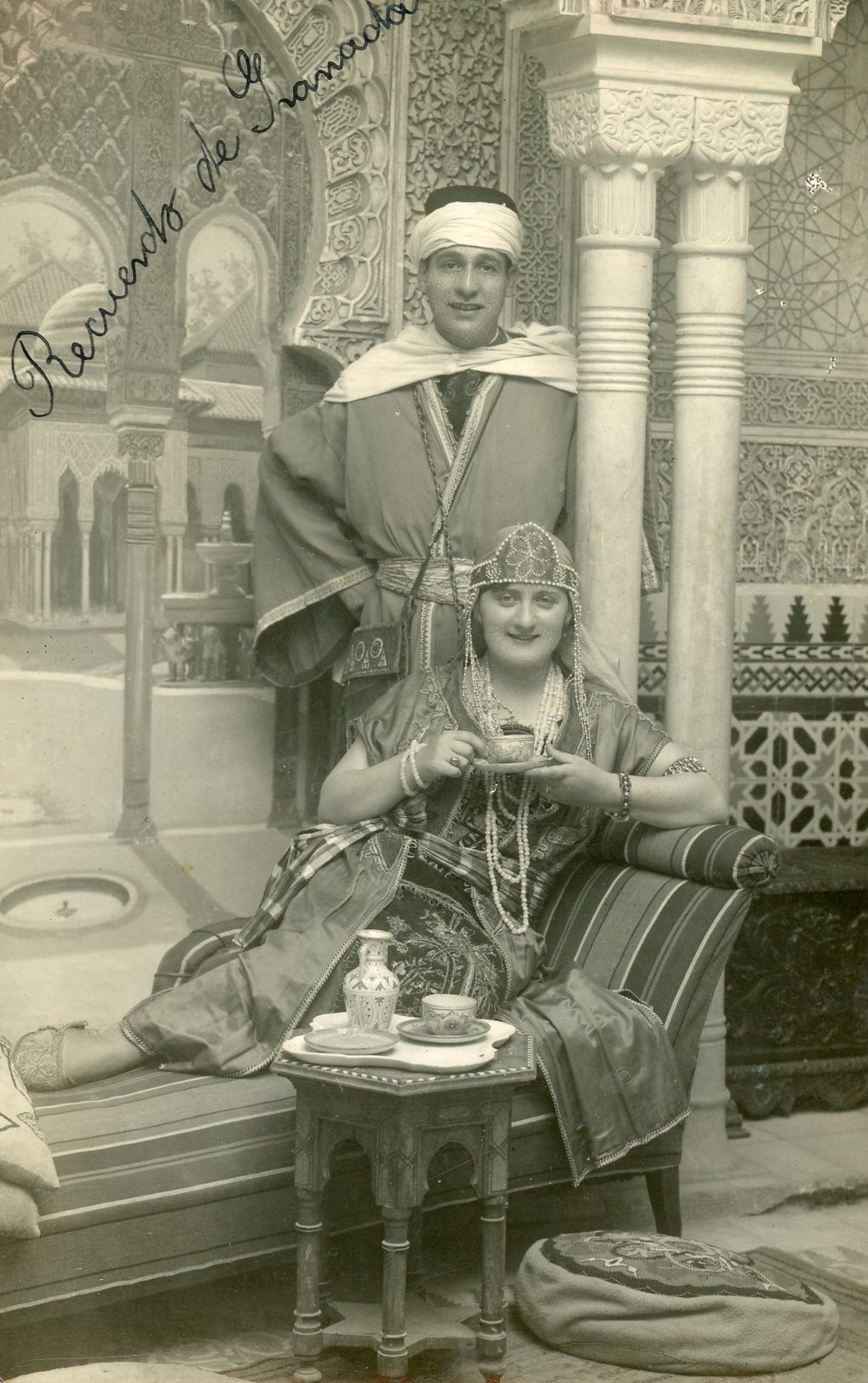 "Recuerdo de Granada" - A couple posing before a background showing the Court of the Lions (Patio de los Leones) at the Alhambra, Granada