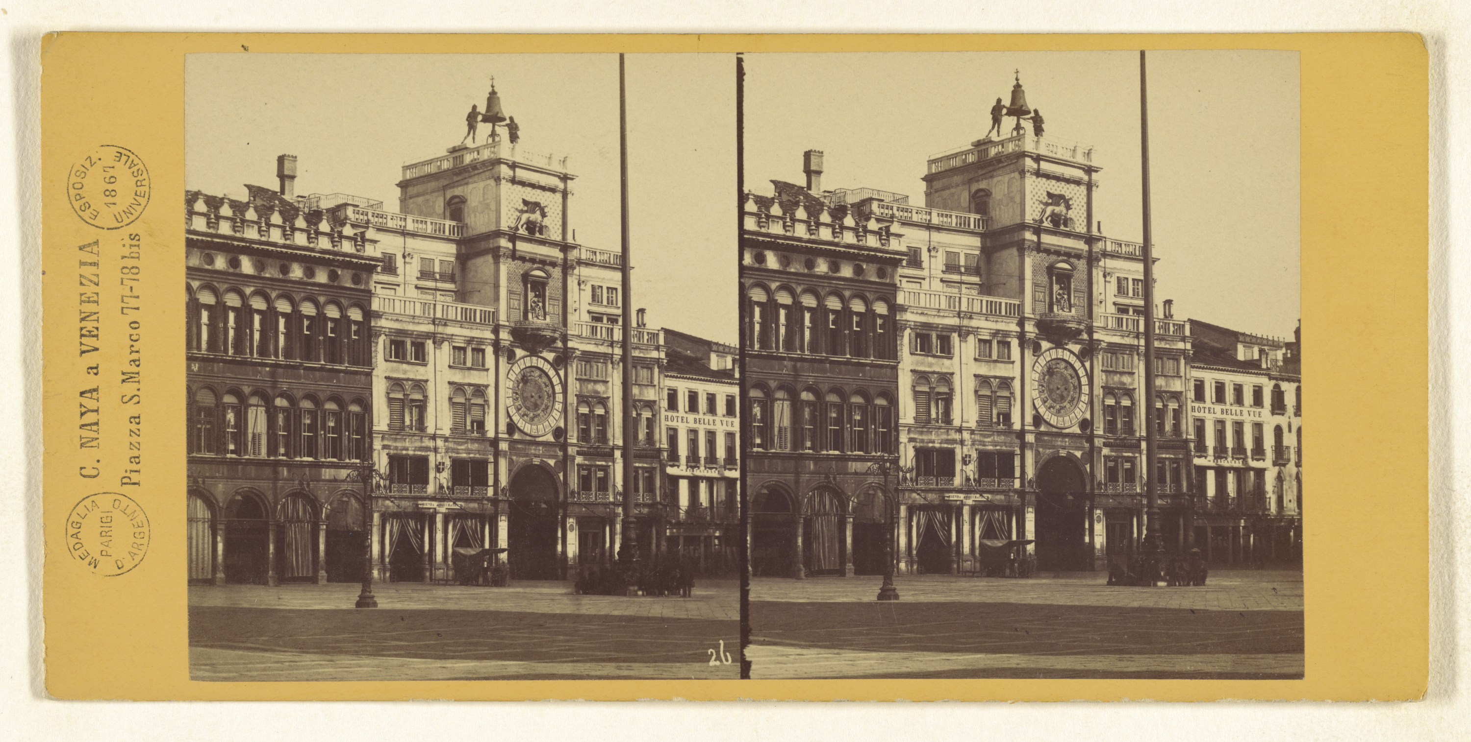 [The famous clock called Torre delle Orologio in the Square of St. Mark. The two bronze figures on top with hammers in their…]
