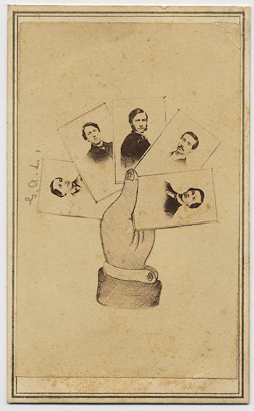 Five vignetted carte de visite portraits held in the hand