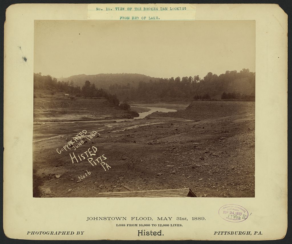 View of the broken dam looking from bed of lake, Johnstown Flood, May 31st, 1889