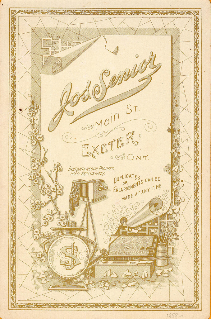 Backmark for "Jos. Senior, Main St., Exeter, Ont."