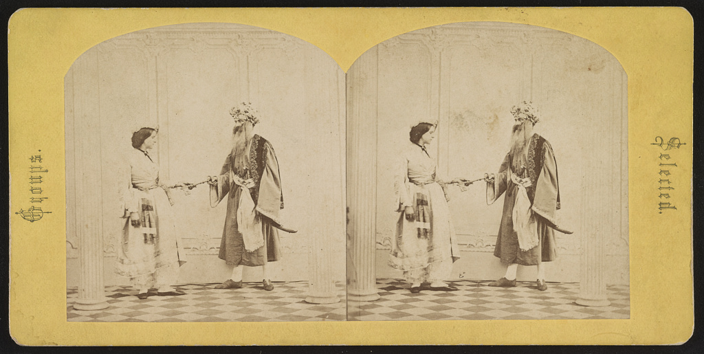 Photograph showing the character Bluebeard with his wife Fatima, in a scene from Story of Blue Beard, or, Female Curiosity.