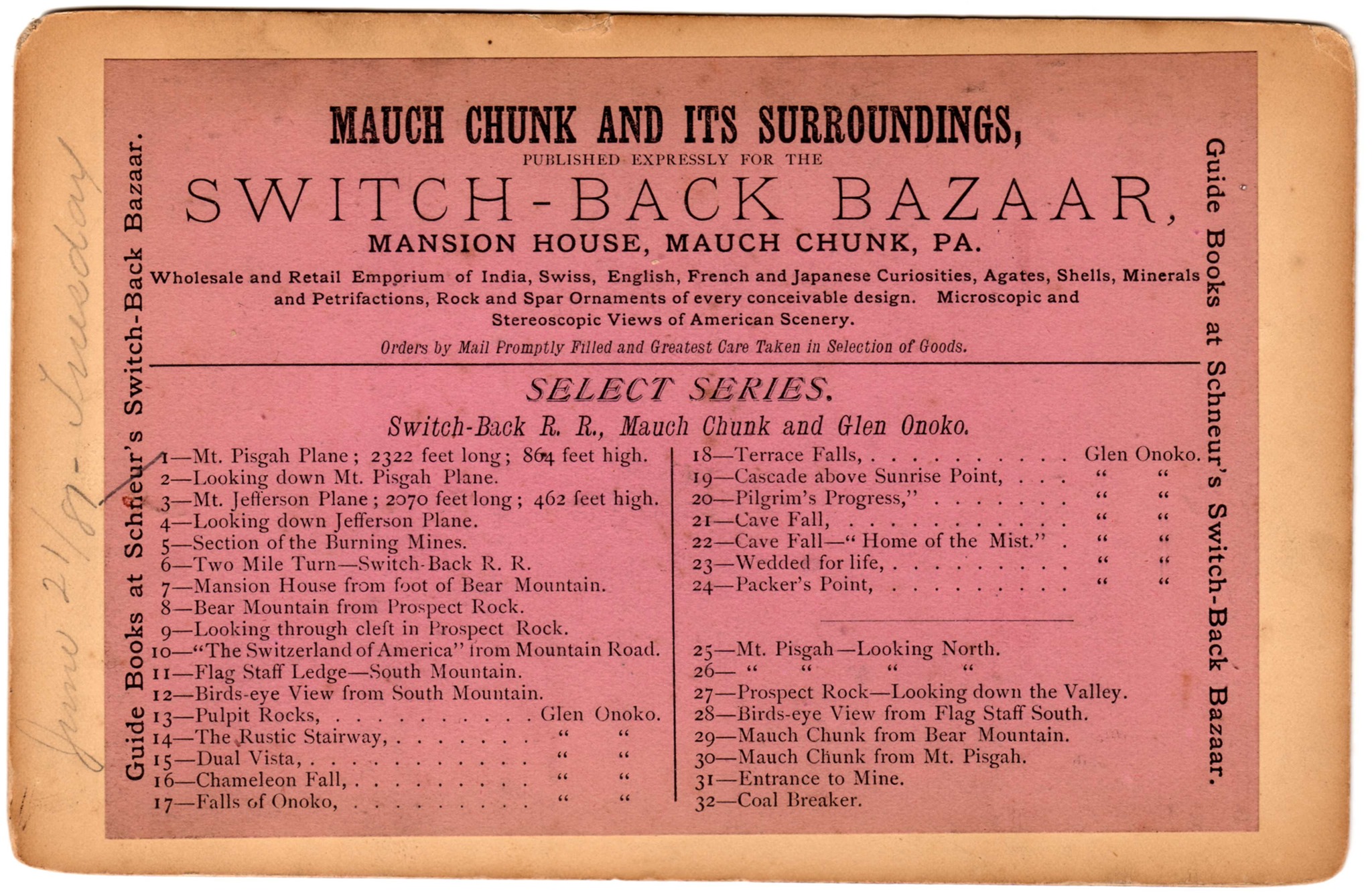 Backlist for "Mauch Chunk and Its Surroundings, Published expressly for the Switch-Back Bazaar, Mansion House, Mauch Chunk, PA."