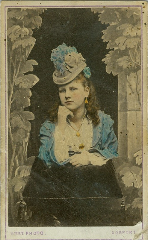 Woman resting on a cushion looking through a stonework and foliage foreground
