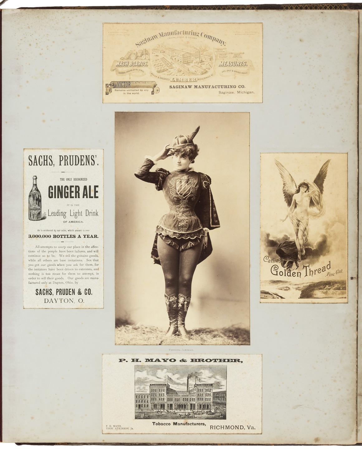 This monumental volume was created by the prominent New York photographer, Napoleon Sarony. Each side of the 23 thick board pages contains a matted albumen photograph and four matted advertising cards. Of the photographs, 42 are large portraits of notable actresses. Portraits of Grover Cleveland and his Vice President, a portrait of the celebrated coronet player Liberati, and a photograph of the Owen paper-making establishment (possibly the producer of this album) are also included. Of the 184 advertisements, 91 are photographs, the others are either engraved, lithographed, or chromolithographed. The large photographs measure 11½ x 6¾ inches (292 x 171 mm.), while the advertisements are mostly 8 x 4 inches (203 x 102 mm.) or the reverse. Produced to sit in the lobby or bar of pre-eminent hotels, art albums were a kind of concierge service, created to entertain and inform visitors of the businesses and pleasures associated with these exclusive establishments. This album is filled with seductive portraits of the stars of the Belle Epoque, including Fannie Davenport, Adelina Patti, Lilly Langtry, Ada Rehan, Lotta Crabtree, Modjeska, Ellen Terry, and Lillian Russell, plus dozens of advertisements for goods and services. All were posed and photographed by the greatest photographer of the American theater, Napoleon Sarony (1821-1896). He established a studio on Broadway in New York in 1866 and for the next thirty years Sarony photographed virtually every actor and actress working on the New York Stage. The Hoffman House was located on Broadway between 24th Street and 25th Street. Built in 1864, it quickly became the informal meeting place for the Democratic Party in New York. Grover Cleveland stopped there frequently, and was living there when he was elected to the Presidency for his second term. General Benjamin Butler and General Winfield Scott made the hotel their home on several occasions, and William Randolph Hearst lived at the Hoffman when he first came to New York City. Edward S. Stokes, who shot financier James Fisk, Jr., became a partner in the hotel, serving as general manager until 1897. The elegant barroom with its shocking painting Nymphs and Satyrs by Bougereau, became a major tourist attraction. Due to their large size and small number, hotel art albums" rarely survived. We have located two others in public institutions. One for the Parker House of Boston is at Brown University, and the other for the Ponce De Leon Hotel of Saint Augustine, Florida is at Jacksonville University.