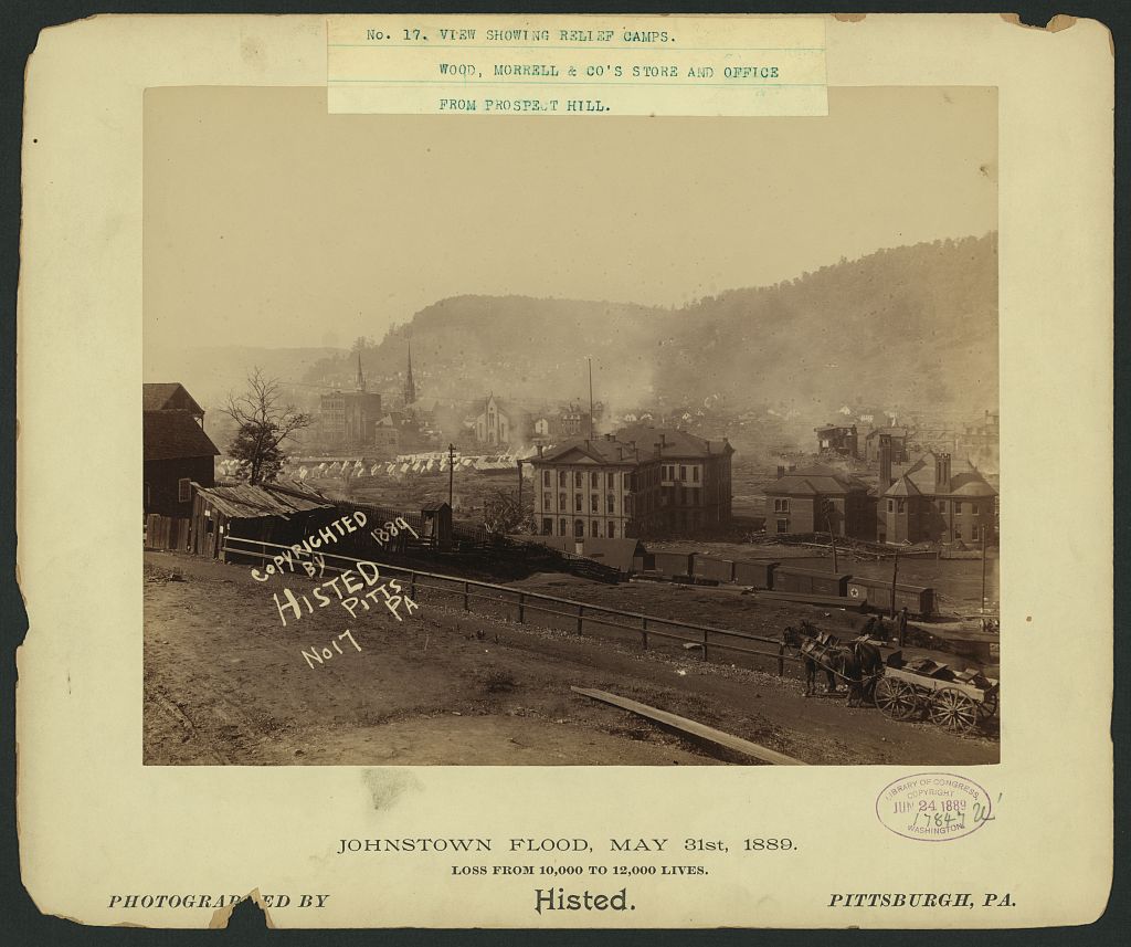 Ernest Walter Histed (1862-1947, Pittsburgh, PA.) 1899 (ca) View showing relief camps; Wood, Morrell & Co.'s store; and office from Prospect Hill, Johnstown Flood, May 31st, 1889 [Johnstown Flood, May 31st, 1990.]