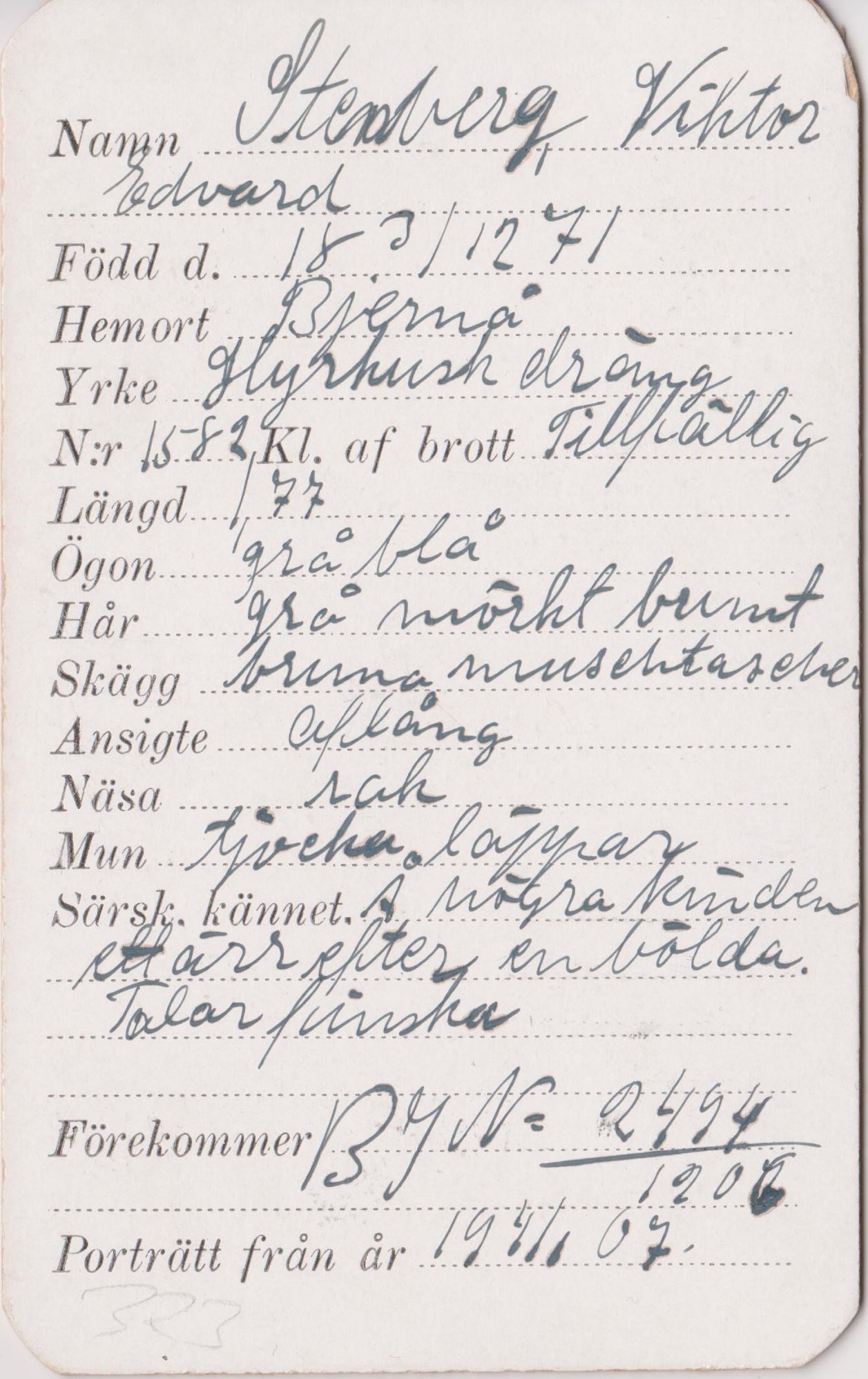 Unidentified police photographer (Sweden) 1907, 4 January Police mugshot for "Viktor Stenberg, born 1871"