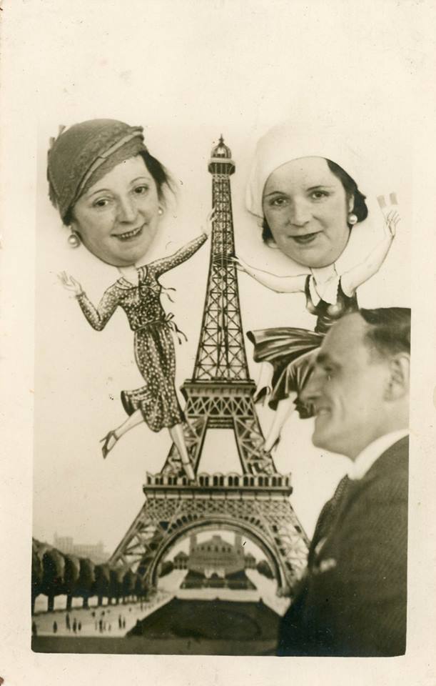 Eiffel Tower head-through-the-window portrait of two women and a man