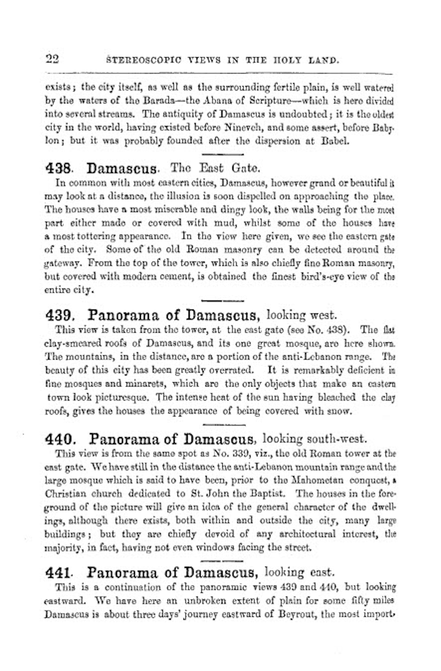 The Holy Land. Descriptive Catalogue of Fifty-Eight Stereoscopic Views in The Holy Land, extending from Jerusalem to Damascus and Baalbec.