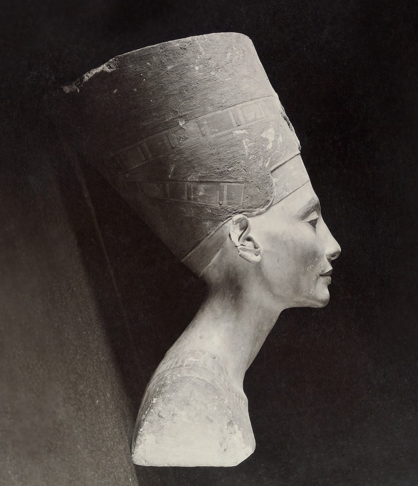 Painted stucco-coated limestone bust of Queen Nefertiti, consort to King Akhenaten who reigned circa 1353-1336 BCE during the 18th Dynasty.