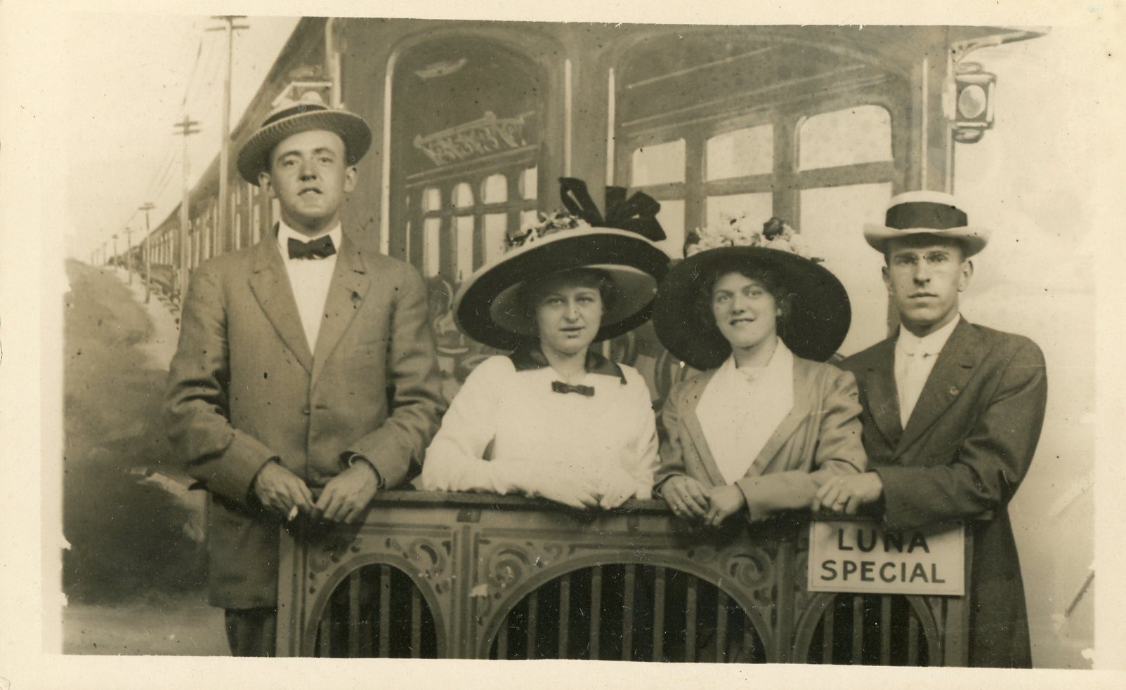 Four people in front of the "Luna Special" painted background, Coney Island, Luna Park