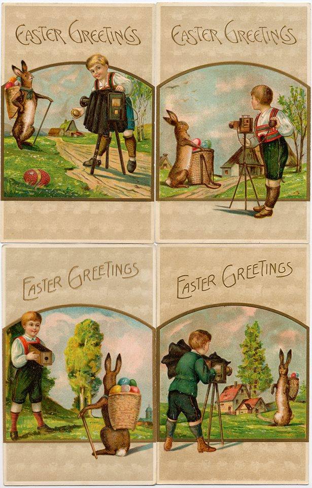 The cards show a boy photographing an Easter hare "Osterhase" (German) putting out coloured eggs for children.