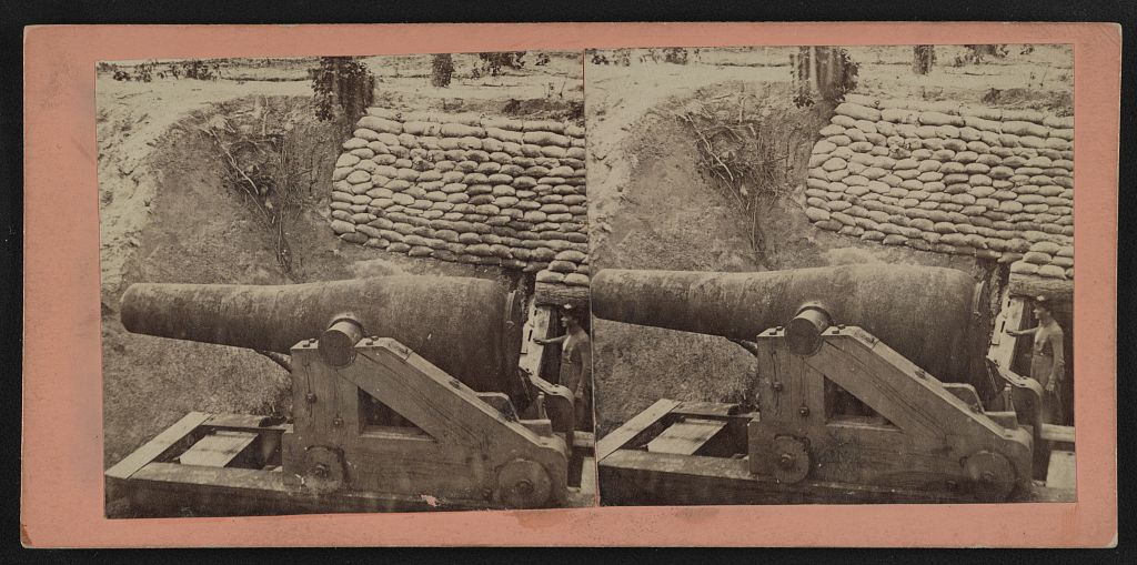 W.F. Browne 1861-1865 Ten Inch Columbiad, and Magazine Entrance, Sand Bag Revertment (i.e. revetment), Battery Dantzler, (Howlett's) on James River [View of Confederate Water Batteries on James River.]