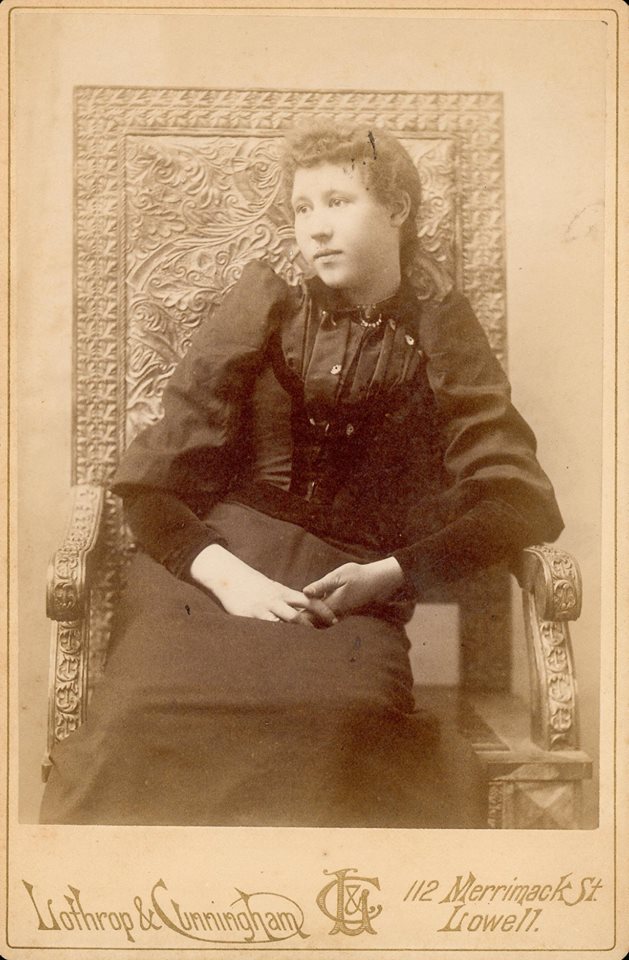 Studio portrait of a young woman seated on a gighly elaborate chair
