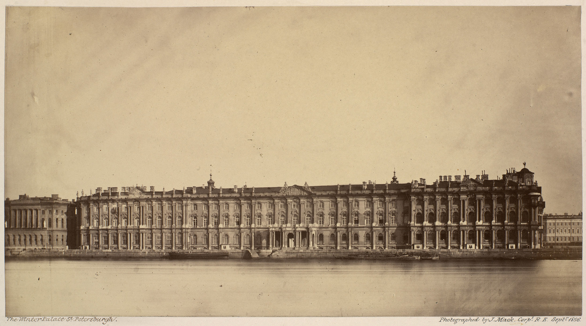 Photograph of the Winter Palace in St Petersburg. The building has three storeys and a small central pediment with three arched doorways below. The windows are interspersed with pilasters and there is a balustrade and a sequence of statues on the roof. In the foreground is the Neva River, with a boat moored in front of the palace to the left of the entrance. The Winter Palace was the official residence of the Russian monarchs. It was begun in the early eighteenth century and altered by several monarchs, notably Catherine II. This is one of a series of photographs taken by Corporal J Mack during the coronation celebrations of Alexander II, Emperor of Russia. He was part of a group of British representatives led by Lord Granville.