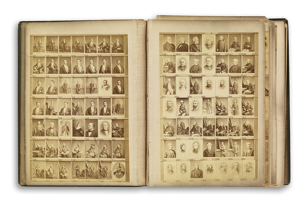 An unusual sample book issued by the photographers Elliott and Fry (of London), with composites of the studio's portrait work of famous men and women of arts and letters. Includes royal figures Empress Eugenie and Don Carlos, plus Trollope, Foster, Ruskin, Browning, Tennyson, Carlyle, Swinburn, Emerson, Wagner, stars of the stage who worked with Gilbert and Sullivan, and more. With approximately 1300 tiny thumbnail examples on 28 mounts.