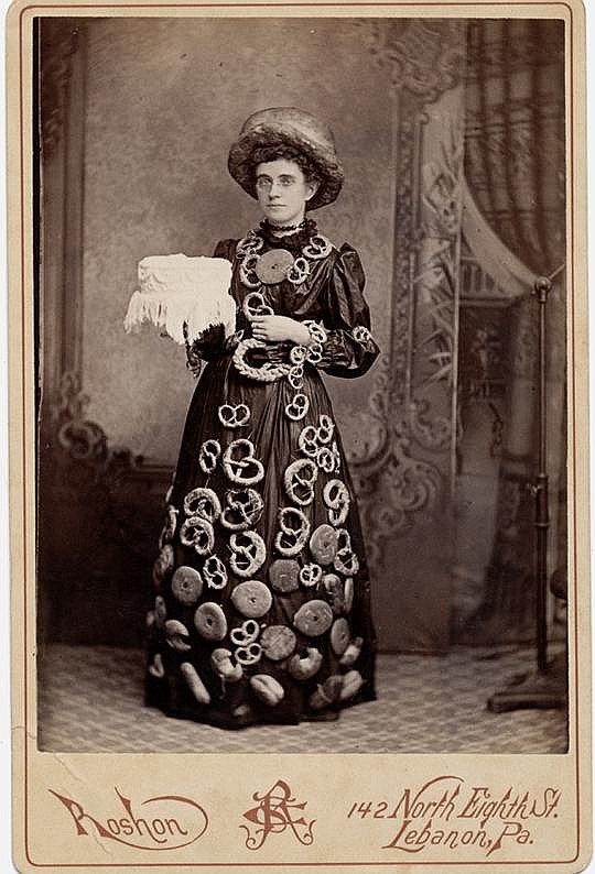 There is a wonderful genre of cabinet cards in which local ladies were dressed up with objects from a certain trade to advertise their wares. This is one for a bakery, (though curiously it isn't named. ) The woman holds a cake and has a cake or loaf of bread on her head. Her dress is adorned with donuts and cookies, and most surprising-pretzels. This is from an area of Pennsylvania still known for its pretzels. The name in pencil on the verso, "Marie Stover" of Williamsport, may be the model.