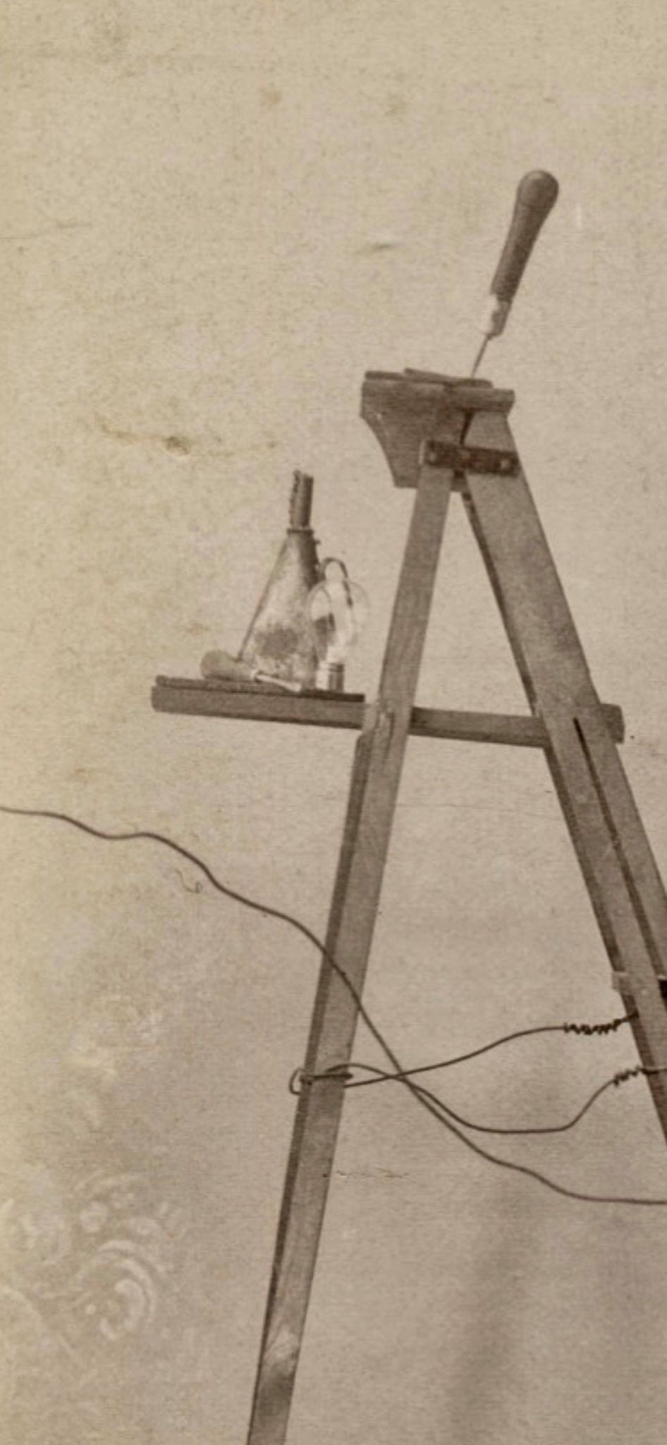 An electrician on a step-ladder inside a photographic studio with a light-bulb on the top step
