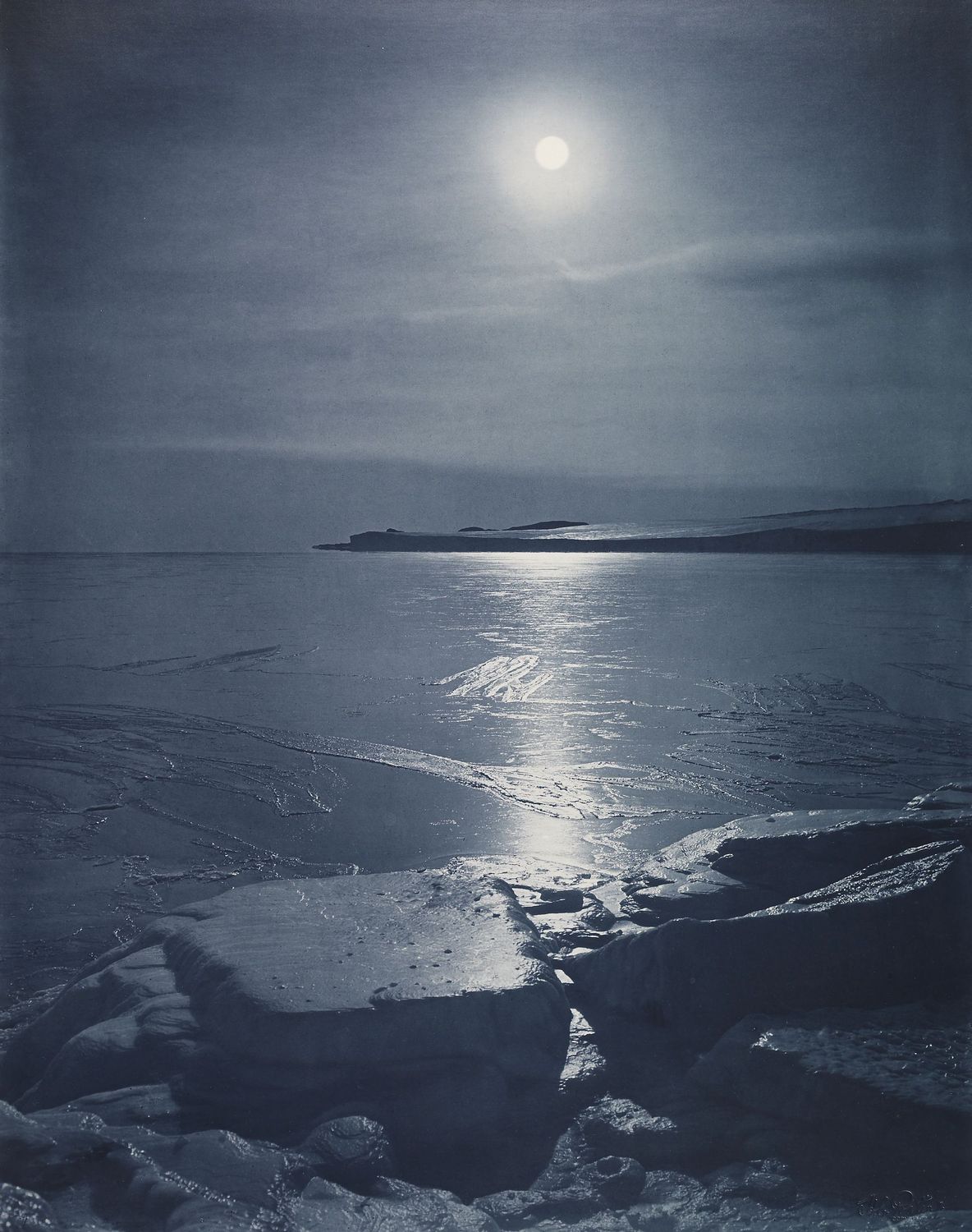 Photograph of a thin film of new ice covering the sea with ice blocks in the foreground. The Barne Glacier can be seen in the distance. This view, looking from Cape Evans towards Cape Barne on Ross Island, shows the moment when the sea began to freeze. The men would have realised that they could no longer leave Antarctica. Once winter began, no ships would be able to reach them to bring in supplies or to take anyone out.