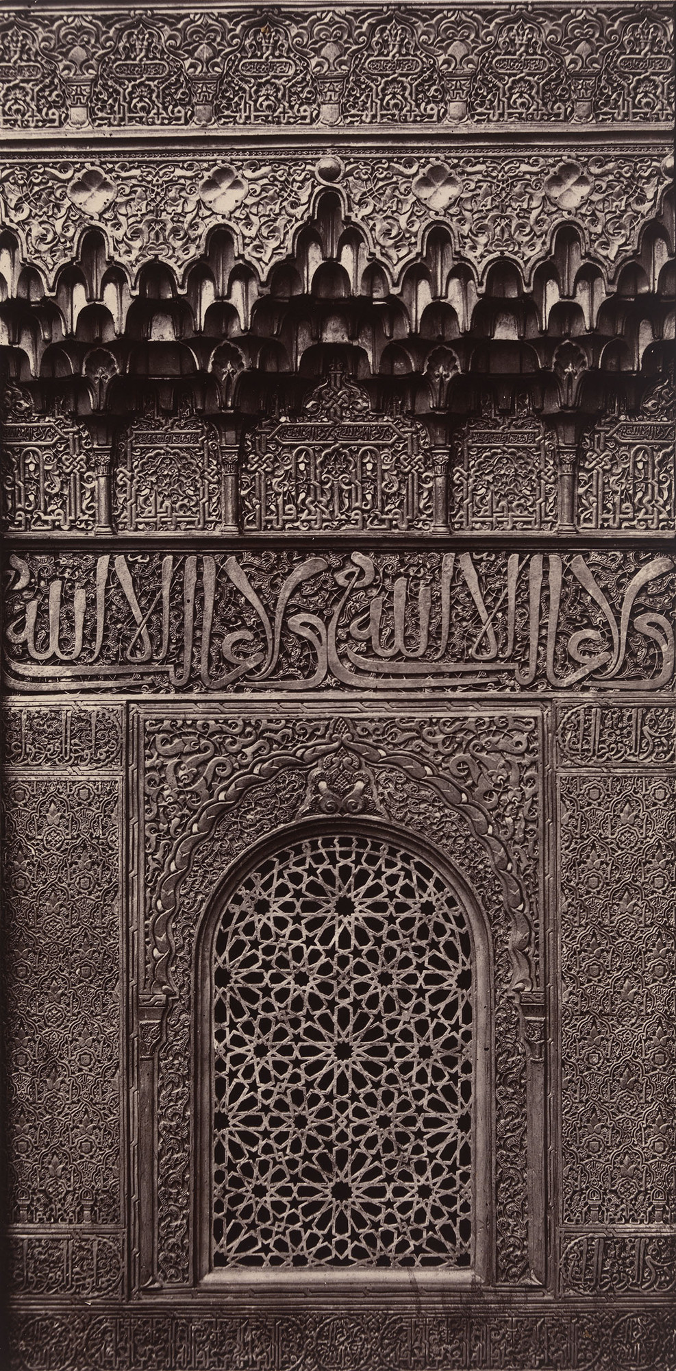 Photograph of the Sala Lindaraja, or the Sultana's window, in the Alhambra, Granada, featuring finely detailed carving and Moorish motifs
