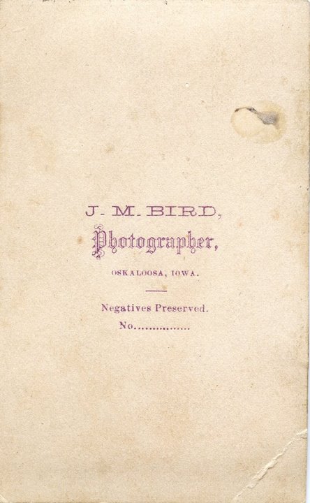 Reverse of carte de visite for J.M. Bird (Oskaloosa, Iowa)