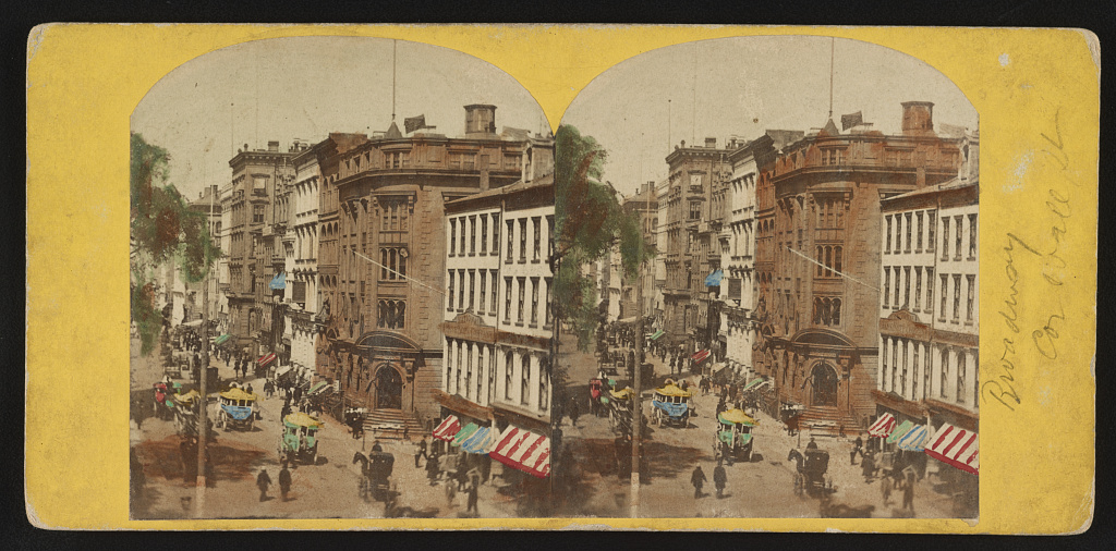 Photograph shows buildings, traffic, National Bank Note Company building on the right, Broadway, New York City, New York. Bank of the Republic Building appears to be draped in mourning bands, likely for Abraham Lincoln's funeral procession.
