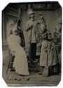 Will. D. Telfer (Harlem Springs Ohio), n.d., Three men standing in front of a wooden house. Near the tree in the middle you can see a fourth person, completely scratched out., Cabinet card, Bazar Nadar / Wouter Lambrechts, LL/129329