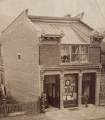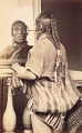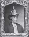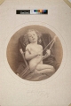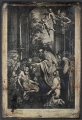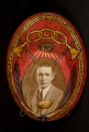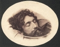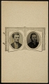 Edward T. Billings (American, b. Canada, 1852-1930), 1875 (ca), Head of man in top hat behind cloth with painted body and scene (hobo with pipe and sack on pole), Tintype, George Eastman Museum, LL/75369