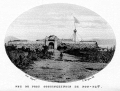 Augustus Le Plongeon, 1877, The statue has now been drawn to the upper part of the inclined plane. The ropes of habin bark are attached to the figure. Near the sculptured slabs at the right, already shown in 3, 5 and 6, Mrs. Le Plongeon appears seated., Magazine plate, Google Books, LL/36220