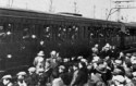 Unidentified photographer (German), 1914, German soldiers, some with flowers others waving or rasing their clenched fists, in a railroad car on the way to the front during early World War I, Black and white photograph, Creative Commons - Wikipedia, LL/66069